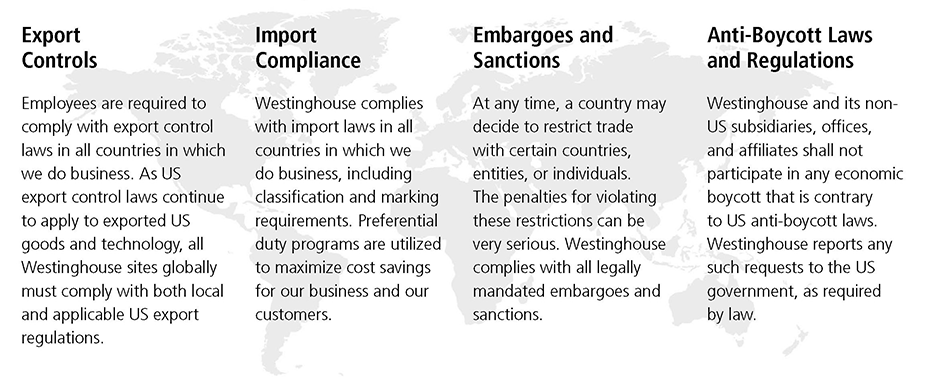 Westinghouse expects its employees to comply with the trade compliance laws in the countries where we do business. The Trade Compliance Program at Westinghouse ensures adherence to laws and regulations controlling the export and import of goods, software, and technology across all borders. The Trade Compliance Program provides employees with guidance in the following areas: