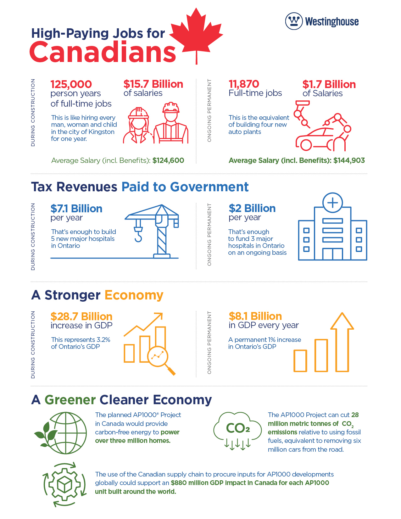 Deploying Westinghouse AP1000® reactors in Canada will add thousands of jobs to the local economy and billions of dollars to the country's GDP. Our mature Canadian supply chain also will contribute to global new AP1000 projects globally.