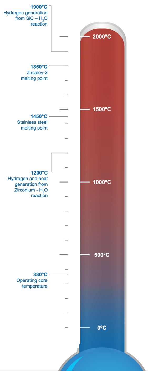 Development of SiC cladding is currently underway, intended to provide groundbreaking safety margin improvements. SiC cladding reacts 10,000 times slower with water and steam than zirconium at 1200°C, resulting in minimal generation of heat and hydrogen in beyond-design-basis accident scenarios.