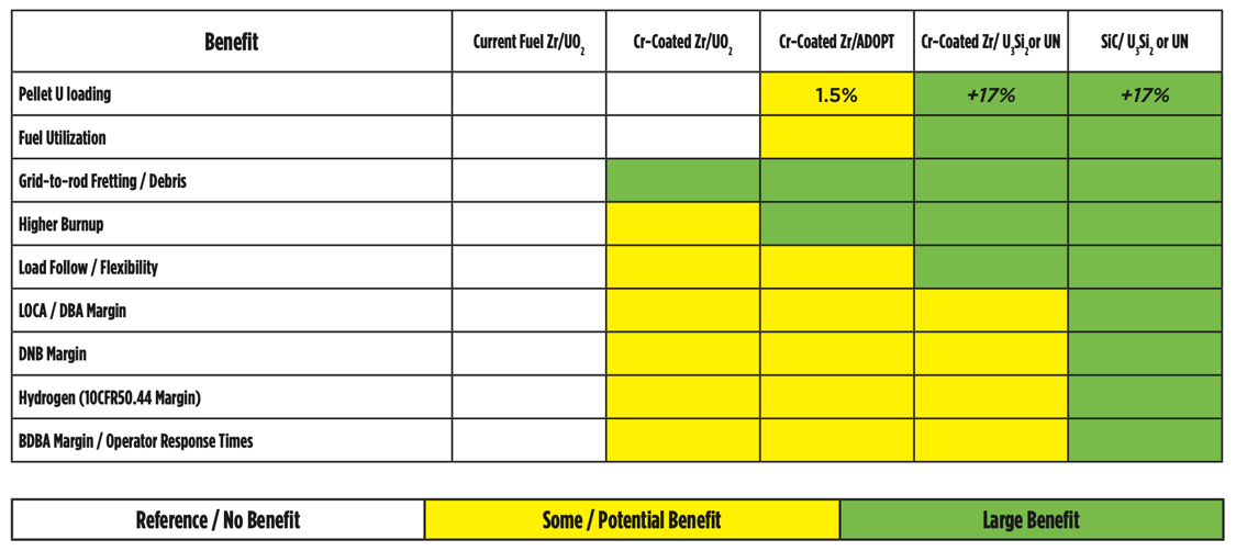 EnCore fuel’s economic and safety benefits come from fuel cycle impacts of replacing UO2 with ADOPT and/or U3Si2 pellets, and from positive impacts on plant core damage frequencies, primarily from incorporating coated zirconium and SiC composite cladding. Along with the increased safety margins inherent in accident-tolerant fuels, utility benefits will be realized as shown in the following table.