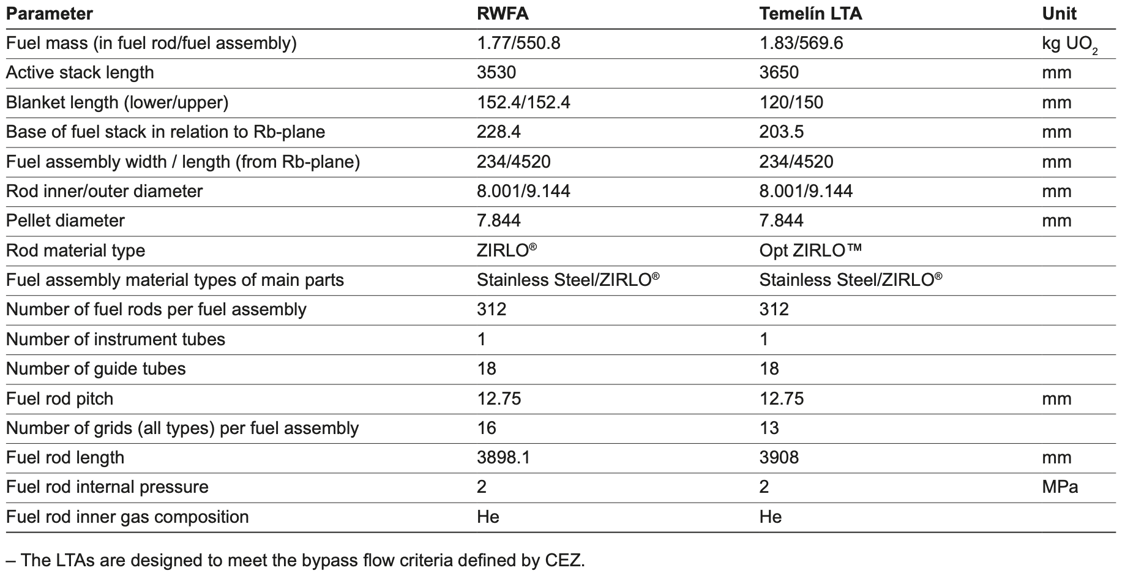 Key data for the RWFA design and the Temelín LTA design are listed in the next section.